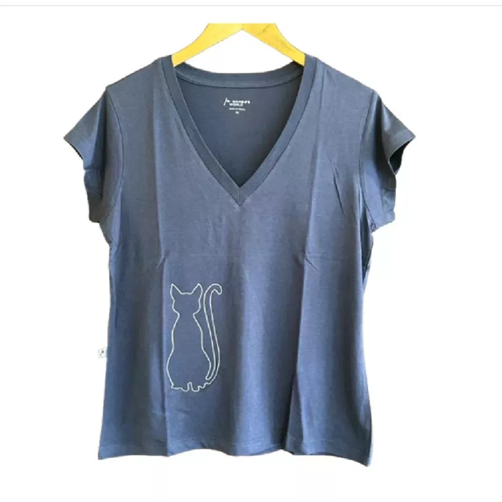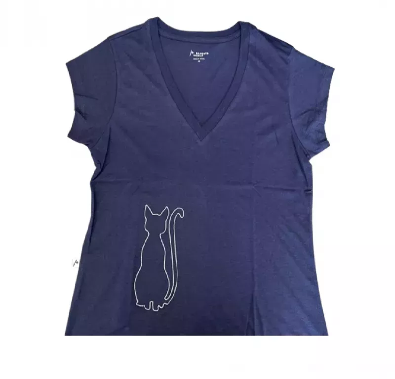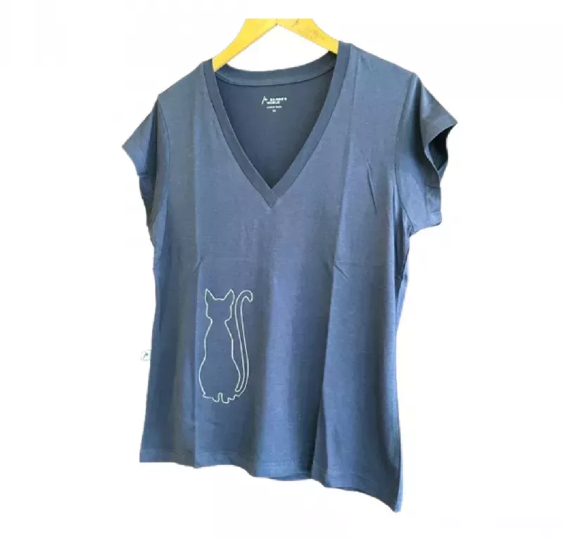 Linda camiseta cor azul marinho em gola V, com bordado de Gato na Lateral na cor branca.