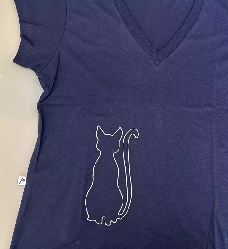 Camiseta Viscose de Bambu Feminina Azul Marinho Gato Bordado V