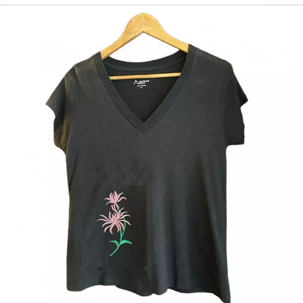 Linda camiseta na cor preta, gola V, e bordado de flor na lateral.