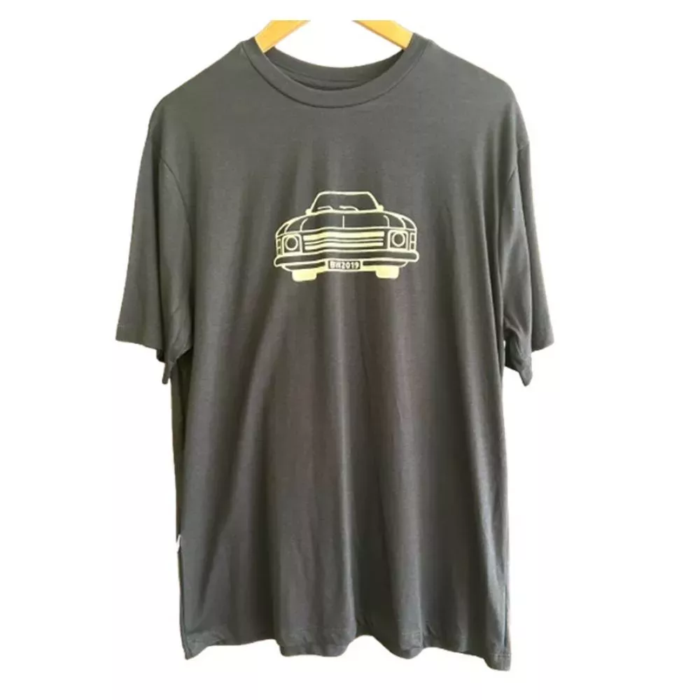 Linda camiseta cor preta, com estampa do carro Opala na cor Creme.