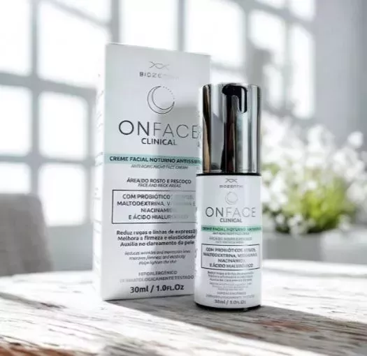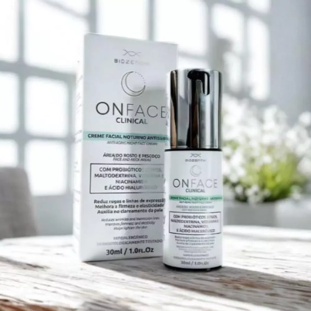 ''Probióticos em hidratantes faciais ajudam a equilibrar a microbiota da pele, fortalecendo sua barreira natural contra agentes externos. Eles reduzem inflamações, acalmam irritações e melhoram a hidratação, resultando em uma pele mais saudável, resistente e com menos vermelhidão ou acne. Esses benefícios tornam Onface Clinical Noturno Antissinais ideais para manter a pele equilibrada, mais uniforme, elástica e protegida.''.