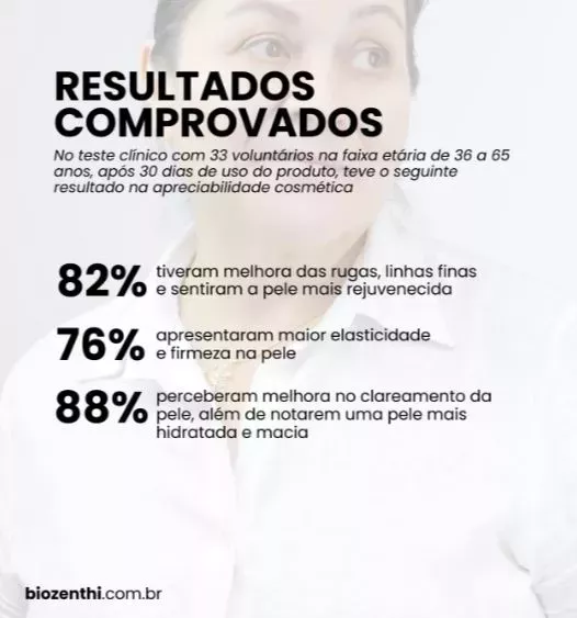 No teste clínico com 33 voluntários na faixa etária de 36 a 65 anos, após 30 dias de uso do produto, teve o seguinte resultado na apreciabilidade cosmética: