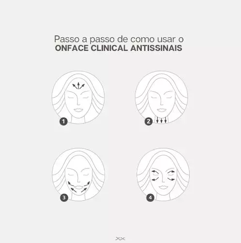 MODO DE USAR: aplique uma pequena quantidade do Onface Clinical Noturno Antissinais no rosto e massageie com movimentos do centro do rosto para fora e de baixo para cima, sempre contra a gravidade. Use-o preferencialmente a noite.